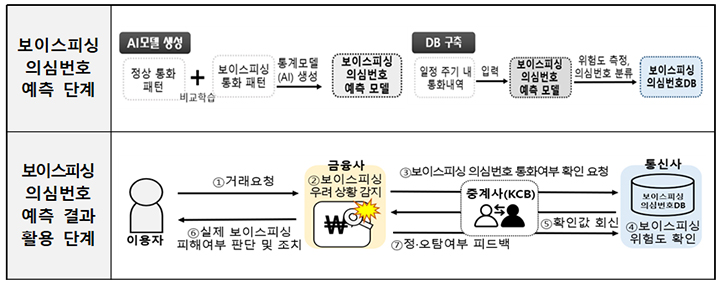 LG유플러스와 KT가 가입자의 전화 수·발신 데이터를 기반으로 인공지능(AI)으로 보이스피싱 의심번호를 예측하고, 이를 금융사 이상거래 탐지·차단 서비스에 적용하는 새로운 시스템을 선보입니다. AI가 수사기관으로부터 받은 보이스피싱 번호의 통화 패턴을 학습해 의심번호 데이터베이스를 구축하고, 금융사는 고객의 의심 상황이 감지되면 해당 번호와의 통화 여부를 조회해 실제 보이스피싱 시 거래 차단 등 즉각 조치합니다. 개인정보위는 이 서비스가 개인정보 오남용 없이 안전하게 운영되도록 다양한 사후관리 방안을 마련했습니다.