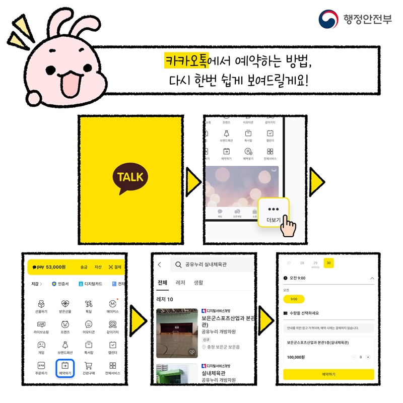 카카오톡에서는 ‘더보기’ 탭 > ‘예약하기’ 메뉴에서 필요한 시설을 바로 찾고 예약할 수 있어요.