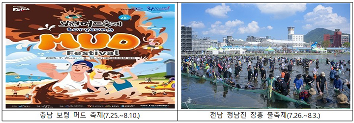 | 보령머드축제 | 충남 보령 | 7월 중·하~8월초 | 머드 체험, 해변 축제, 국내외 인기 |