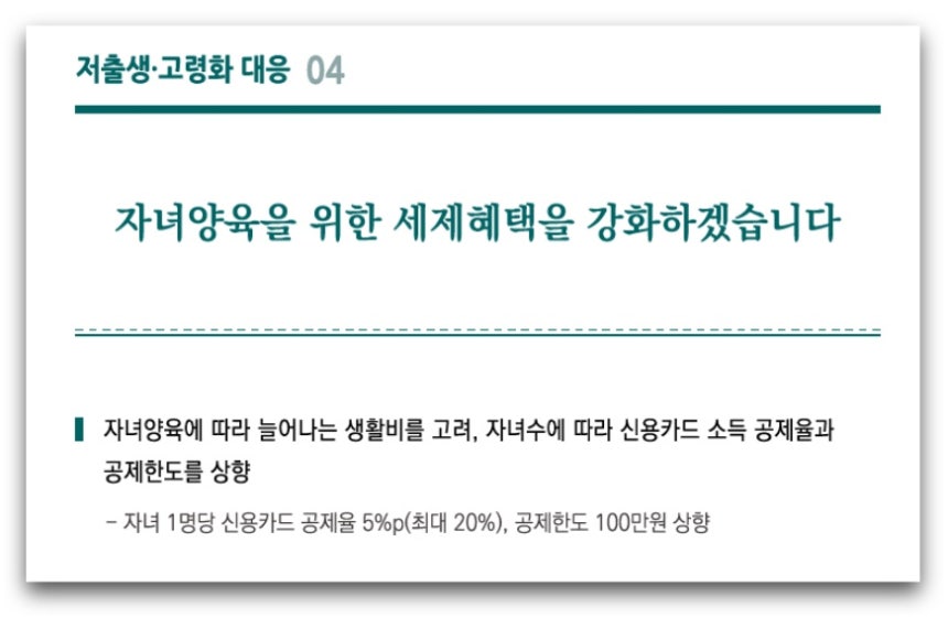 이는 이재명 대통령의 대선 공약인 **'자녀 수에 비례한 신용카드 소득공제율·공제 한도 확대'**와 일치하는 정책 방향입니다. 👨👩👧👦