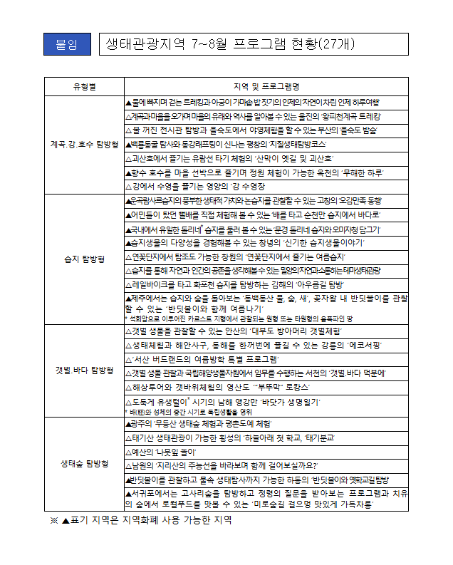 • 참여 가능 지역과 프로그램, 예매 방법 등 자세한 사항은 7월 21일부터 ‘우리나라 생태관광 이야기’ 공식 사이트(eco-tour.kr)에서 반드시 확인!