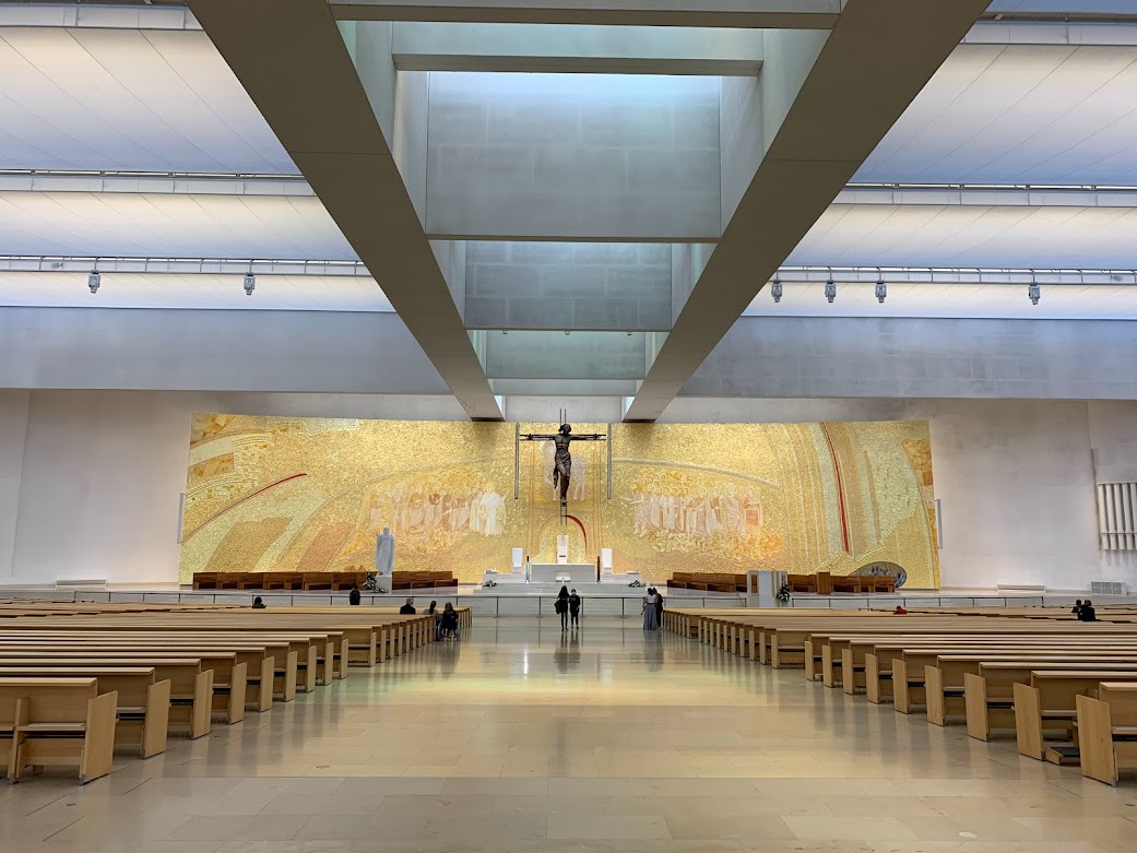 이 성당의 가장 큰 특징은 ‘미니멀리즘’과 ‘영성’이 공존한다는 점이다. 하얀 석회암으로 마감된 내부 공간은 불필요한 장식 없이 오직 기도와 침묵, 성찰을 위한 공간으로 구성되어 있다. 중앙 제단 위에는 거대한 금빛 십자가와 그리스도 판화(모자이크)가 설치되어, 보는 이로 하여금 경건함에 잠기게 만든다. 또한 이 성당은 파티마의 세 명의 어린이 순례자들을 기리는 예배 공간과 묵주기도 경당, 다양한 국제 언어로 운영되는 미사 시스템 등 현대 순례자들의 필요를 적극 반영한 설계를 자랑한다.