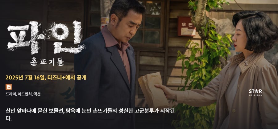 '파인: 촌뜨기들'은 디즈니+에서 2025년 7월 첫 공개된 범죄·드라마 시리즈로, 1977년 목포 앞바다에 가라앉은 보물선을 두고 생계를 위해 모인 촌뜨기들의 속고 속이는 모험을 그린다. 류승룡(관석), 양세종(희동) 등 다양한 캐릭터가 얽히며 범죄와 생존, 욕망이 교차하는 과정을 그려낸다. 실제 고가의 도자기를 노리는 인물들과 알력, 예상치 못한 사건들이 긴장감을 더하는 피카레스크 스타일의 작품이다.