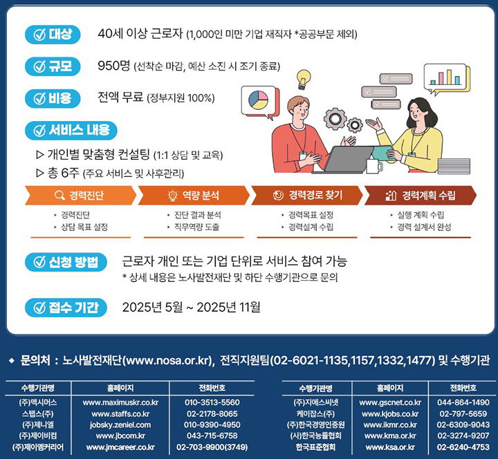 고용노동부와 노사발전재단은 2025년부터 40세 이상 중장년 근로자를 위한 '커리어 플래닝 서비스'를 도입해 시범 운영합니다. 이 서비스는 경력진단, 역량분석, 경력 탐색, 경력계획 수립 등으로 구성되며, 6주 동안 1:1 맞춤형 컨설팅으로 진행됩니다. 1000인 미만 기업 재직 중장년이라면 누구나 무료로 참여 가능하며, 생애주기별 경력설계·역량강화·직무전환(업스킬링/리스킬링)·재취업까지 실제 현장 맞춤형 지원이 핵심입니다.
