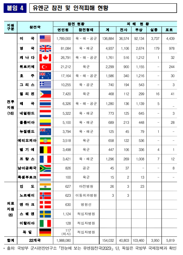 • 대한민국을 지킨 22개국 유엔군(전투 16개국, 의료 6개국), 195만여 명이 참전,