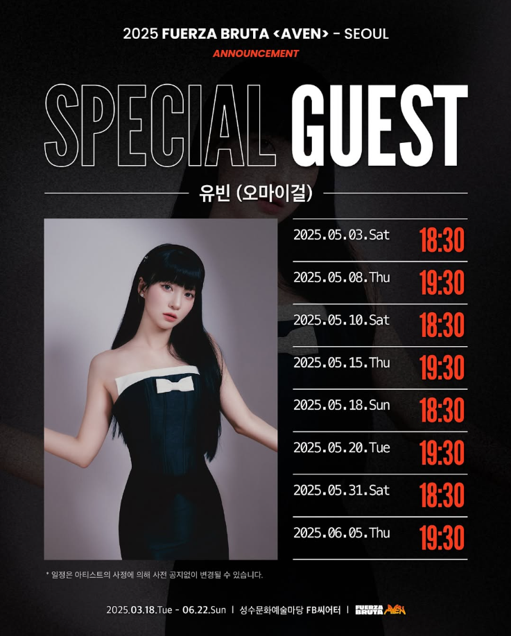 K-POP 대표 걸그룹 오마이걸(OH MY GIRL)의 멤버 유빈이 글로벌 공연 브랜드 '푸에르자 부르타(Fuerza Bruta)'의 한국 공연에 스페셜 게스트로 출연해 화제를 모으고 있습니다. 이번 특별 출연은 K-POP 아티스트와 글로벌 퍼포먼스 아트의 만남이라는 점에서 더욱 주목받고 있는데요, 유빈의 색다른 도전과 그 무대의 매력을 지금부터 소개해 드립니다.