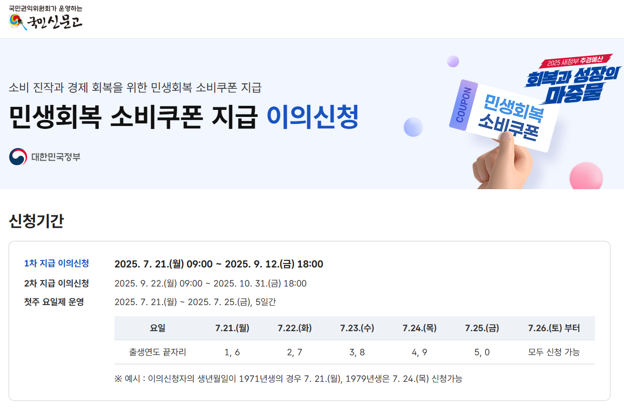2025년 7월 21일부터 전국민 대상 ‘민생회복 소비쿠폰’ 지급이 시작되었습니다. 지급 금액이나 자격 등에 이의가 있을 때는 국민신문고 누리집에서 온라인으로 이의신청이 가능합니다. 이의신청은 7월 21일부터 10월 31일까지 운영되며, 신청 방법·필수 서류·요일제 등 주요 절차를 반드시 숙지해야 합니다. 이 포스팅에서는 세부 일정과 절차, 유의사항, 실전 꿀팁까지 안내합니다. 😊
