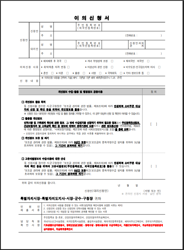 - 증빙서류(주민등록, 가족관계, 기타 확인자료) 미리 준비