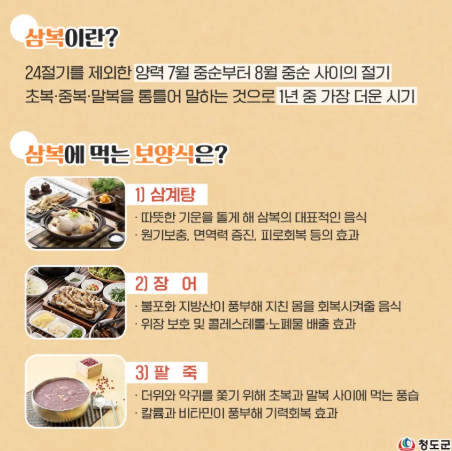 말복은 여름이 끝나갈 무렵, 이미 기진맥진해진 몸을 마지막으로 다시 보하는 시점입니다.