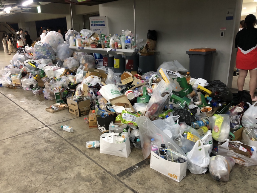 일회용 트레이, 플라스틱 컵, 비닐봉지, 쿨링 패치, 응원 막대풍선(금지품목까지!) - 🚮 휑한 자리에 남겨진 음식물, 덜 비운 병·캔, 심지어 국물 흘러내린 식품쓰레기💦