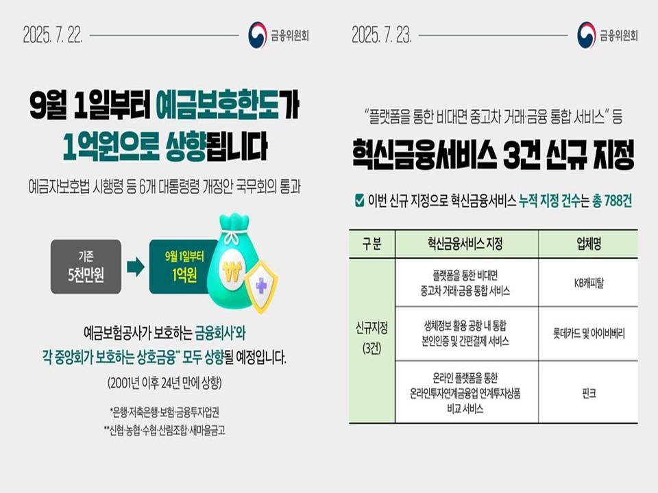 9월 1일부터 예금보호한도가 기존 5천만원에서 1억원으로 두 배 상향되며, 은행·저축은행·보험·금융투자 및 각종 상호금융까지 모든 금융기관에 적용됩니다. 정부는 수해 피해자와 중소기업을 위한 긴급 금융 지원책과 맞춤형 상담센터를 운영 중이며, 비대면 중고차 플랫폼 등 3건의 혁신 금융서비스도 신규 지정되었습니다. 디지털 신분증, AI 데이터 기반 신용평가, 공공데이터 개방 등 데이터·AI 활용 금융혁신도 빠르게 확산되고 있습니다.