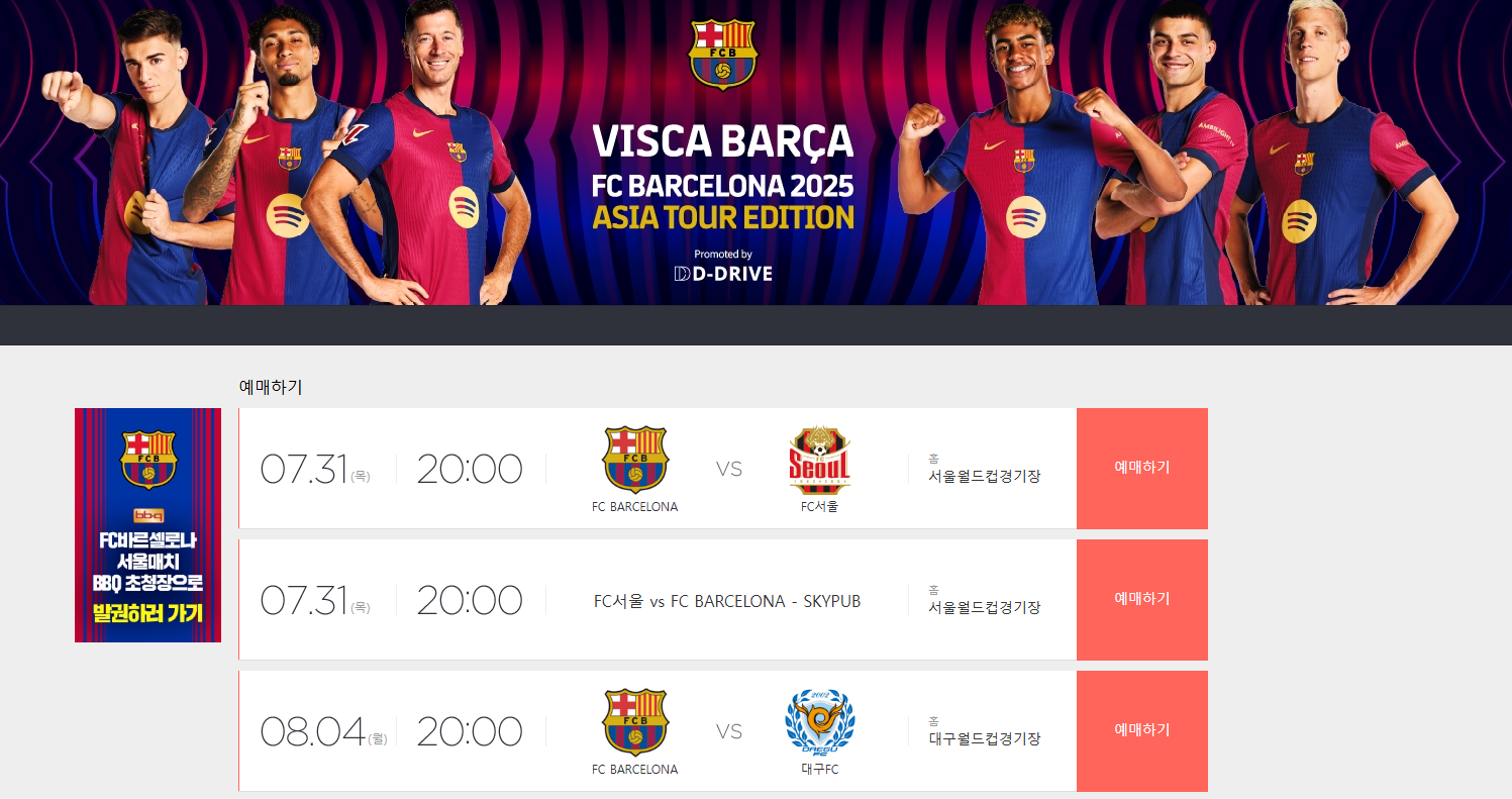 최근 바르셀로나가 일본 비셀고베전에서 경기 취소 해프닝을 겪으면서 국내 팬들 분위기가 술렁이기도 했습니다. 하지만 디드라이브 주최 측은 한국 내 두 경기가 차질 없이 ‘100% 진행된다’고 공식 발표, 모든 전광판(티켓 예매, 경기 일정, 팬 이벤트)도 정상 운영됩니다.