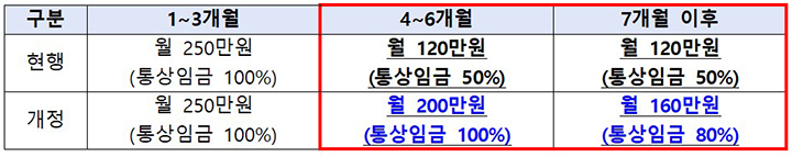- 4개월차 이후부터 통상임금 50% (상한 월 120만원)