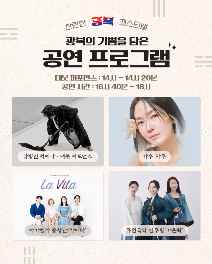 - 아카펠라 합창단 ‘라비타’, 퓨전국악 ‘가온락’, ‘자두’ 등 광복을 기념하는 특별 무대
