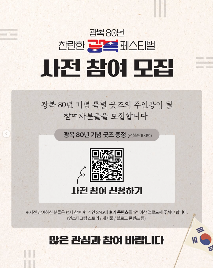 - 행사 SNS 멘션, 해시태그(@gwangbok80, #광복80년페스티벌) 필수 활용!