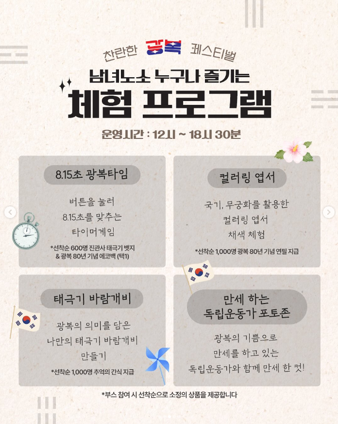 - 사전신청 방문객 선착순 100명, 현장서 특별한 광복 80년 기념품 받기