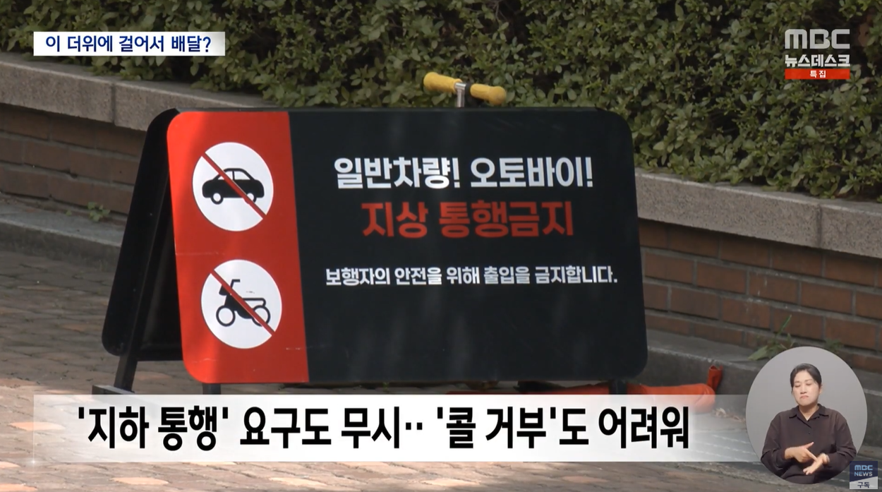- 배달원 노동권 침해(폭염, 폭우, 장거리 도보, 경제적 손실)