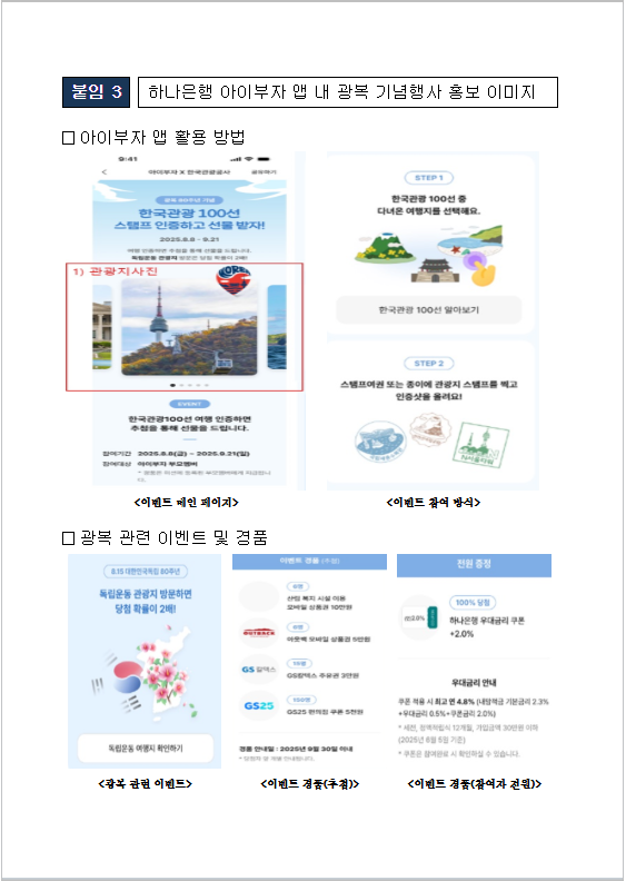 • 방법 : 한국관광 100선 전체(광복 명소 13곳 포함) 방문 인증하면