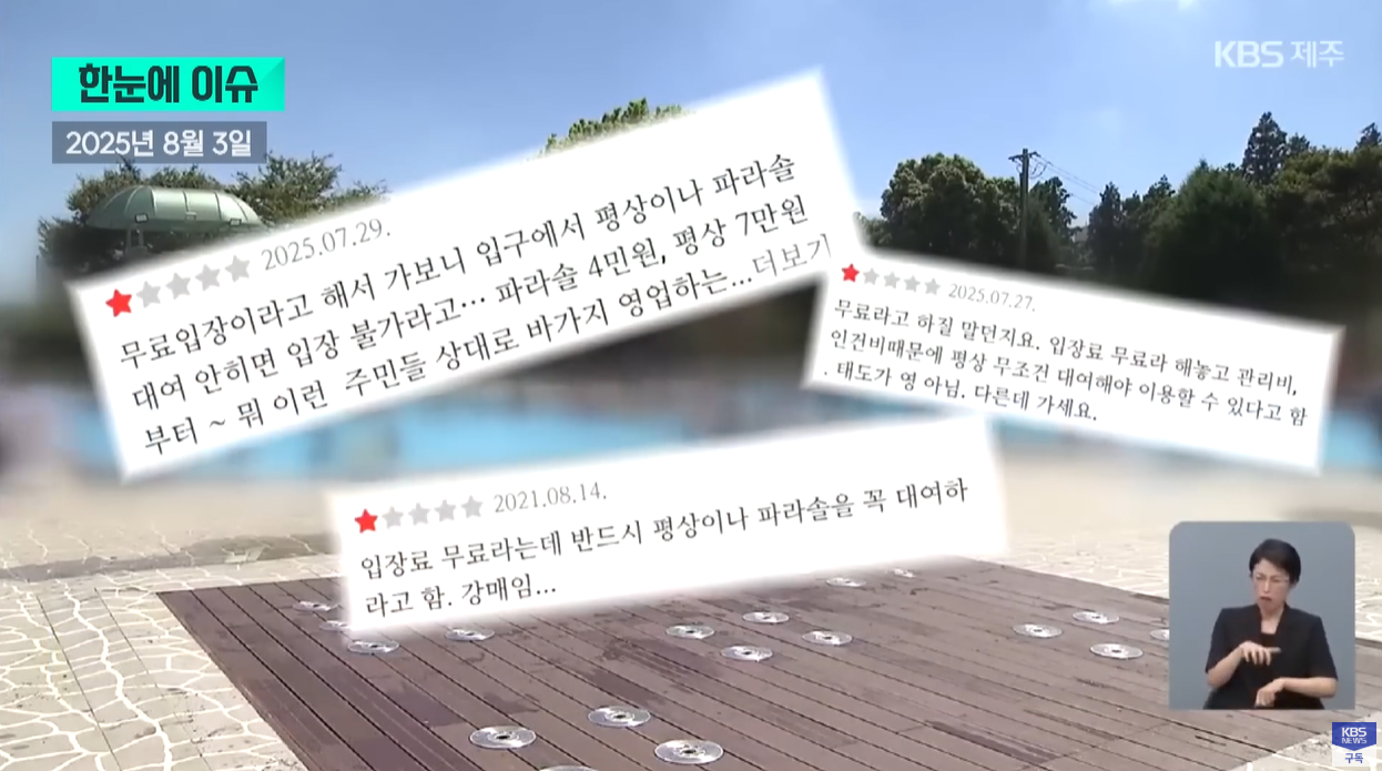 - “무료해수욕장이라 찾아갔는데, 파라솔 안 빌리면 해변 진입 제한.”