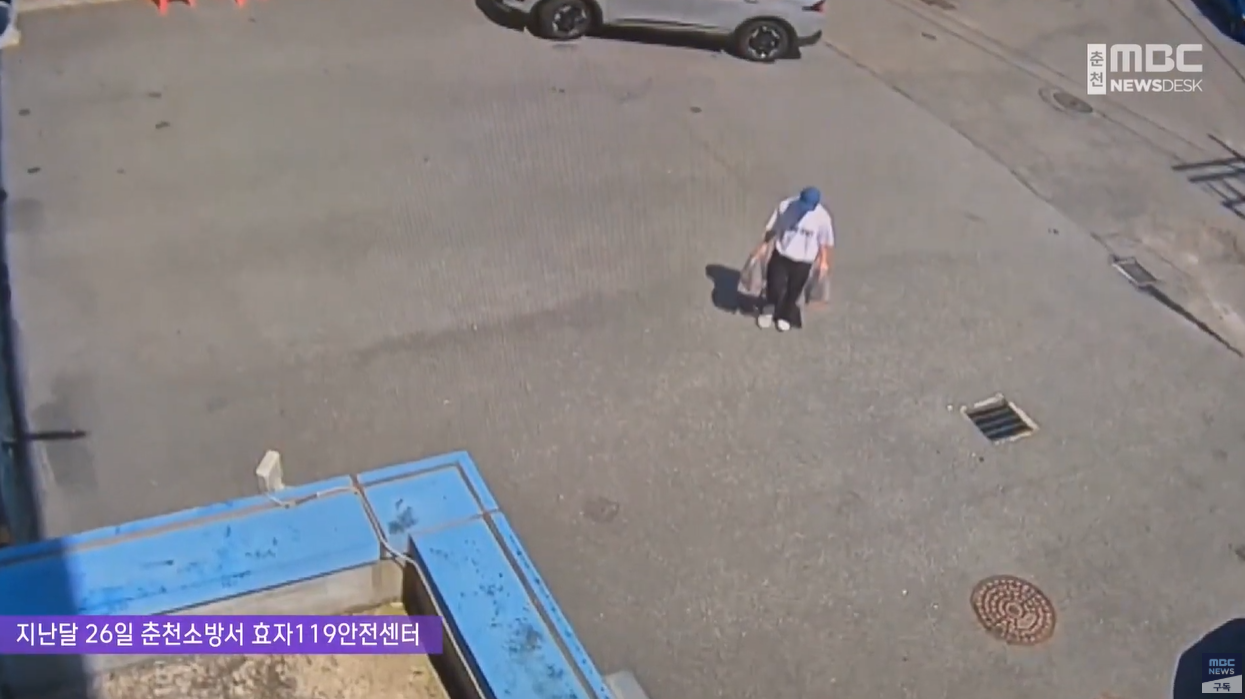 차에서 내린 한 남성이 양손에 무언가를 들고 소방서로 향합니다.