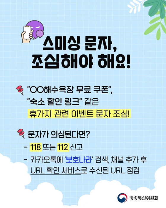 - 스미싱 혐의 문자 즉시 신고(118/112·카카오톡 보호나라 등)