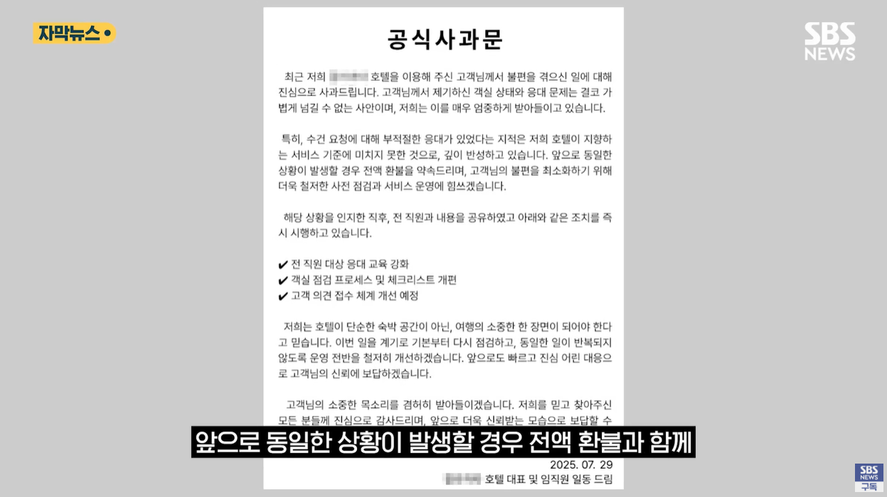 4. 호텔 측 공식 사과문 발표, 뒤늦은 대처와 재발 방지 약속 📃🙏