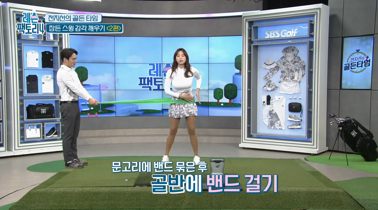 - 밴드를 발목에 걸고 무릎 살짝 굽힌 뒤, 어드레스 자세