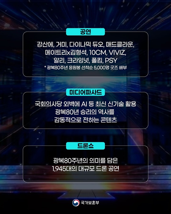 - 미디어파사드: 국회의사당 외벽에 AI 및 첨단 기술을 활용한 미디어파사드가 광복 80년의 승리와 감동 역사를 영상으로 구현합니다.