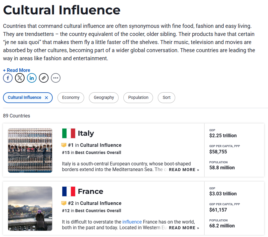 🧭 US News의 ‘Cultural Influence’ 랭킹 구성 방식