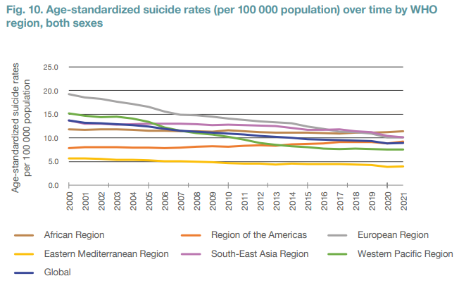 전 세계 자살의 73%는 저·중소득국가에서 발생, 아프리카와 남미 소국들이 상위를 굳건히 차지합니다. 반면, 고소득국가 대다수는 자살률 개선세를 보이는 중이며, 21년 글로벌 평균은 8.9명(10만명당)으로 내려갔지만, 아메리카 지역만은 20년 사이 오히려 17% 상승한 것으로 드러났습니다.