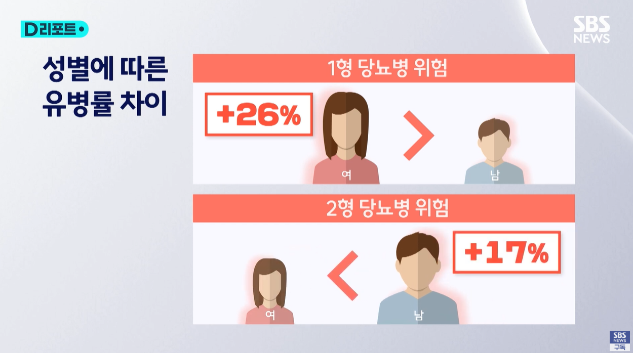 - 1형 당뇨병은 여성 환자가 남성보다 26% 더 많은 반면,
