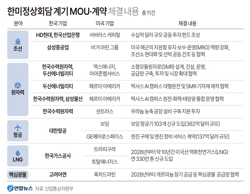 이번 행사에서 우리나라와 미국 양국은 제조업 분야의 전략적 협력을 위해 조선, 원자력, 항공, LNG, 핵심광물 등 5대 산업을 중심으로 무려 11건의 계약 및 양해각서(MOU)를 체결하는 큰 성과를 냈습니다.