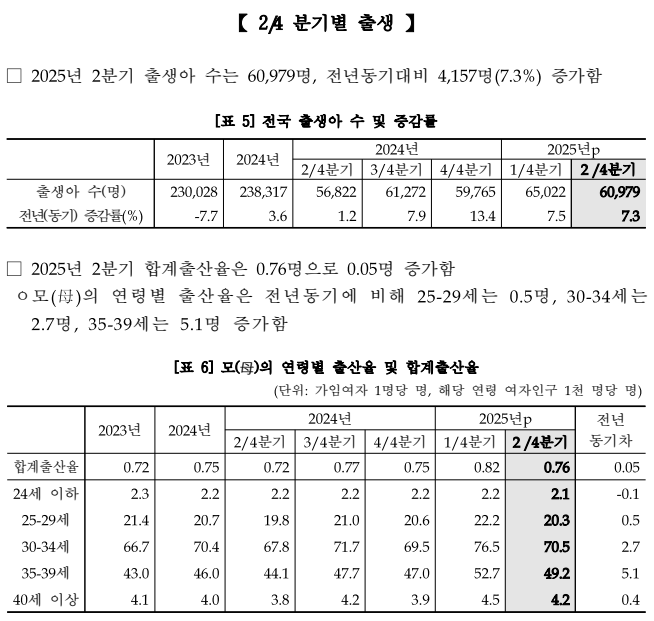 - 30대 초반 여성 인구 증가: 아이를 가장 많이 낳는 연령대인 30대 초반 여성 인구가 늘어난 것도 주요한 원인 중 하나입니다. 실제로 30대 초반과 후반 여성의 출산율은 각각 5.6%와 7% 증가하며 전체 출생률 상승을 견인했습니다. 반면, 20대 후반 여성의 출산율은 3.3% 감소하여 연령대별 출산 경향의 변화를 보여주기도 했습니다.