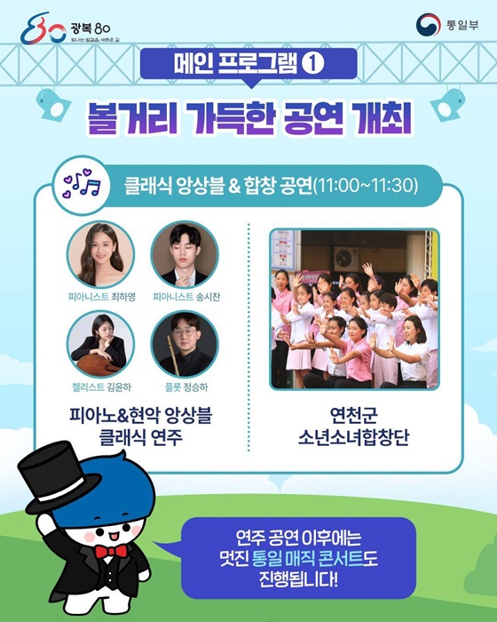 한국예술종합학교 출신의 실력파 연주자들로 구성된 앙상블이 아름다운 클래식 연주를 선보입니다. 🎻 피아니스트 최하영과 송시찬, 첼리스트 김윤하, 플루티스트 정승하의 아름다운 선율은 웅장한 기념식의 분위기를 더욱 고조시킬 것입니다. 또한, 연천군 소년소녀합창단의 맑고 고운 목소리가 한반도 평화를 염원하는 노래를 부르며, 모두에게 깊은 감동을 선사할 것입니다. 🎶