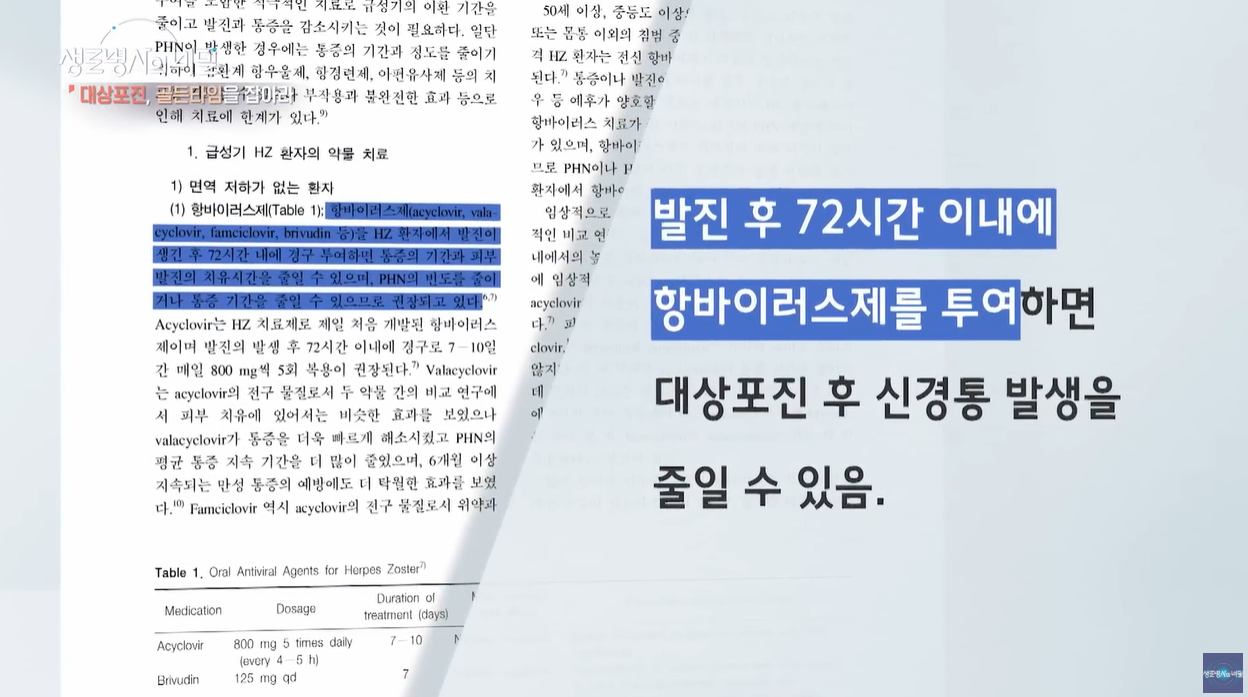 어떤 환자는 '바람만 스쳐도 칼로 베는 듯 아프다'고 호소하고, 또 다른 환자는 '통증 때문에 차라리 죽고 싶다는 생각을 했다'고 말할 정도로 고통스럽습니다. 그러므로 피부에 띠 모양의 발진이 나타나고 통증이 느껴진다면, 단 1분이라도 빨리 병원을 찾아야 합니다. 🏥