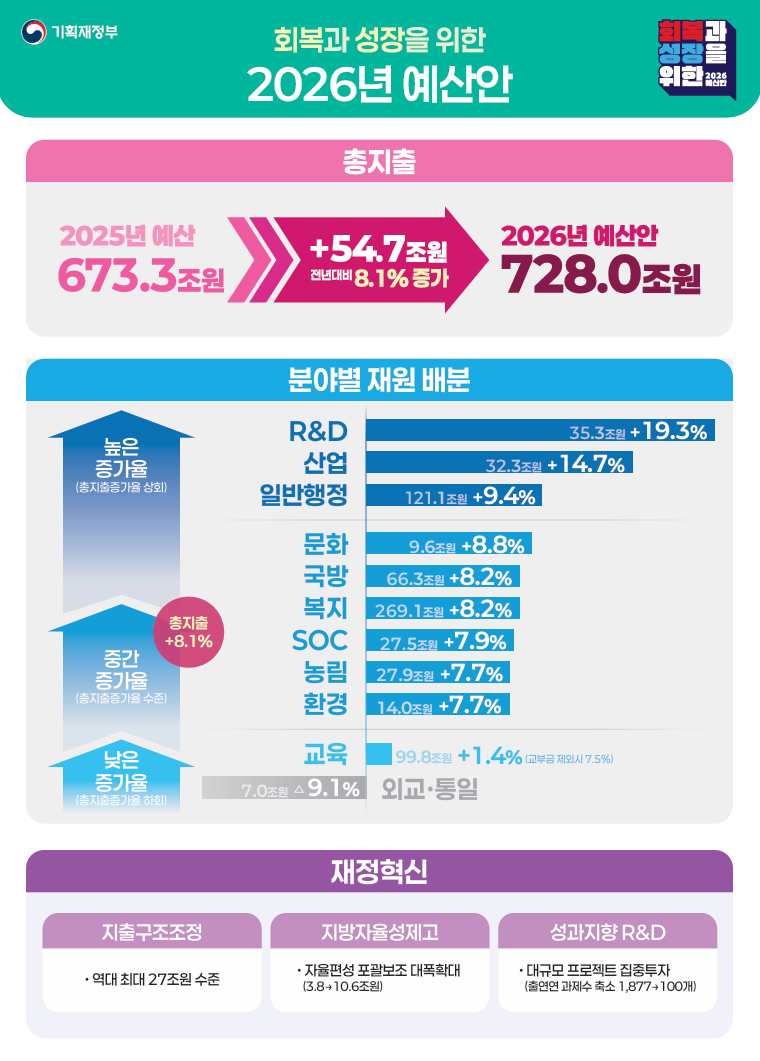 안녕하세요, 잡학다식(雜學多識)입니다. "와, 내년 예산이 700조 원을 넘는다고요?" 이 놀라운 소식이 현실이 되었습니다. 정부가 2026년도 예산안을 약 728조 원 규모로 편성했습니다. 이는 올해보다 8.1% 증가한 역대 최대 규모로, 사상 처음으로 700조 원의 벽을 넘어선 '슈퍼 예산'입니다. 이번 예산안은 단순한 지출 증가를 넘어, '적극재정'을 통해 대한민국을 회복과 성장의 선순환 구조로 이끌겠다는 강력한 의지를 담고 있습니다.