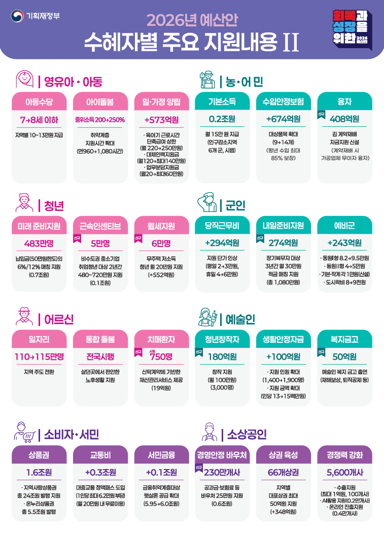- 고령층: 노인 일자리가 110만 개에서 115만 개로 확대되고, 어르신 대상 '지역사회 통합돌봄' 사업 예산이 대폭 늘어납니다. 👵👴