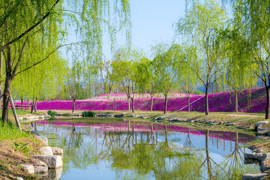 봄철 거창 창포원은 튤립, 벚꽃, 창포꽃이 어우러져 활짝 피어나는 절정의 시즌입니다.