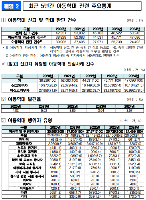 - 변화하는 가해자의 얼굴: 흥미로운 점은 부모 외에 대리양육자(어린이집 교직원 등)나 친인척의 비중은 소폭 감소했지만, 이웃이나 낯선 사람의 비중은 2.4%p 증가했다는 것입니다. 이는 학대가 더 이상 특정 집단에 국한되지 않고, 사회 전체의 문제로 확산되고 있음을 시사합니다.