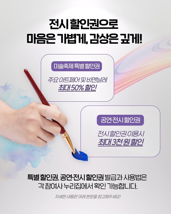 공연·전시 할인권: 미술축제 특별 할인권 이용 시 추가로 최대 3,000원까지 할인받을 수 있는 쿠폰입니다. 마치 뷔페에 가서 메인 요리를 먹고, 디저트까지 챙겨 먹는 기분이죠! 이 할인권은 특히 가족, 친구들과 함께 여러 전시를 관람할 때 큰 도움이 될 것입니다.