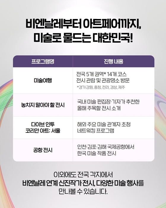 미술여행: 전국 5개 권역(경기·강원, 충청, 전라, 경상, 제주)의 아름다운 관광 명소와 전시 관람을 연계한 14개 코스의 미술여행이 마련되었습니다. 역사적 의미가 깊은 문화유산부터 자연의 절경, 그리고 신선한 예술 작품까지 한 번에 즐길 수 있는 특별한 패키지입니다.