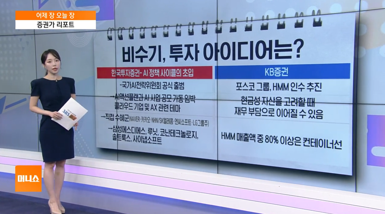 한국투자증권: 9월 투자 유망 섹터로 AI(인공지능)를 꼽았습니다. 정부의 AI 관련 정책 수혜가 예상되는 네이버, 카카오, SK텔레콤, 엔씨소프트 등을 추천했습니다. 이 외에도 삼성SDS, 루닛, 코난테크놀로지 등도 함께 언급했습니다.