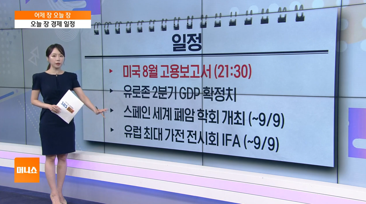 주요 이벤트: 오늘 밤 발표될 미국 고용보고서는 앞으로의 금리 정책을 가늠할 중요한 지표가 될 것으로 보입니다. 또한 독일에서 열리는 IFA 가전 박람회와 스페인에서 열리는 세계 전복 시장도 주목할 만한 이벤트로 꼽혔습니다.