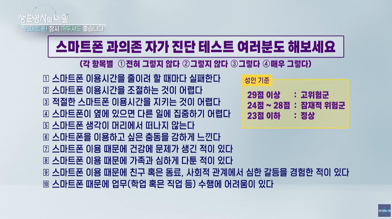 스마트폰은 우리에게 편리함을 가져다주었지만, 동시에 우리의 건강과 삶의 질을 위협하고 있습니다. 이번 기회에 자신의 스마트폰 사용 습관을 점검하고, '스마트폰 과의존'에서 벗어나기 위한 노력을 시작해 보는 건 어떨까요?