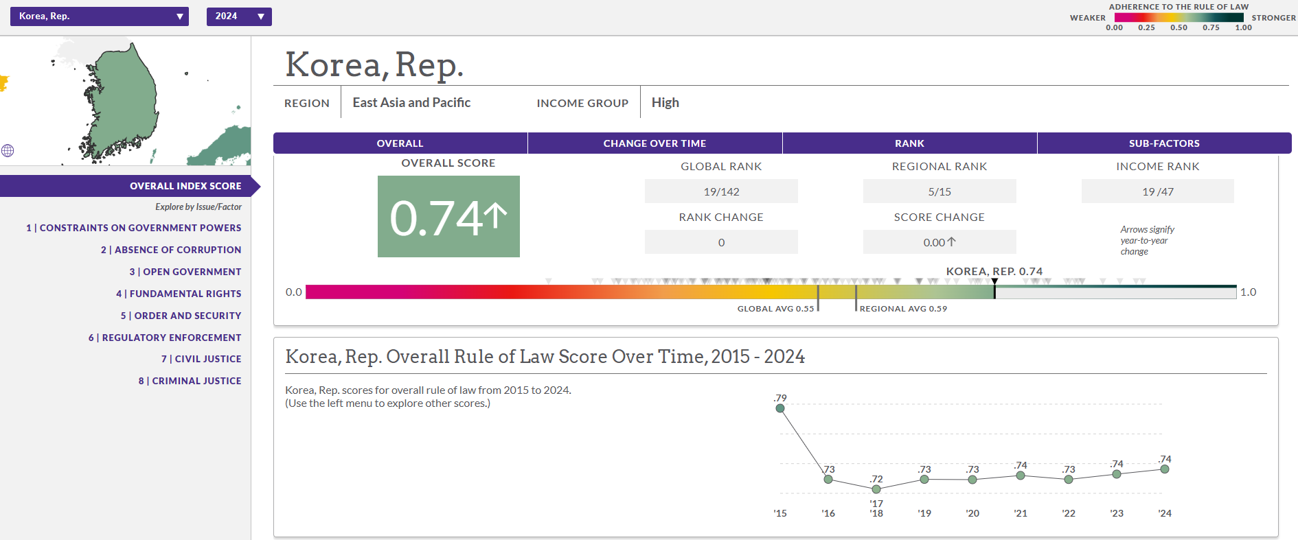 종합 점수: 1점 만점에 약 0.74점으로, 이는 선진국 수준에 근접한 탄탄한 법치 체계를 갖추고 있음을 의미합니다.