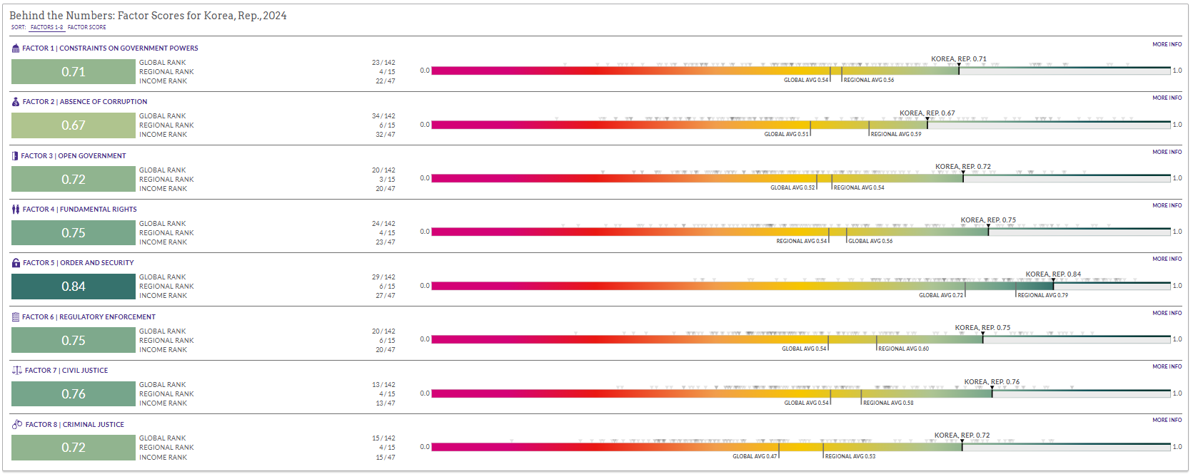 종합 점수: 1점 만점에 약 0.74점으로, 이는 선진국 수준에 근접한 탄탄한 법치 체계를 갖추고 있음을 의미합니다.