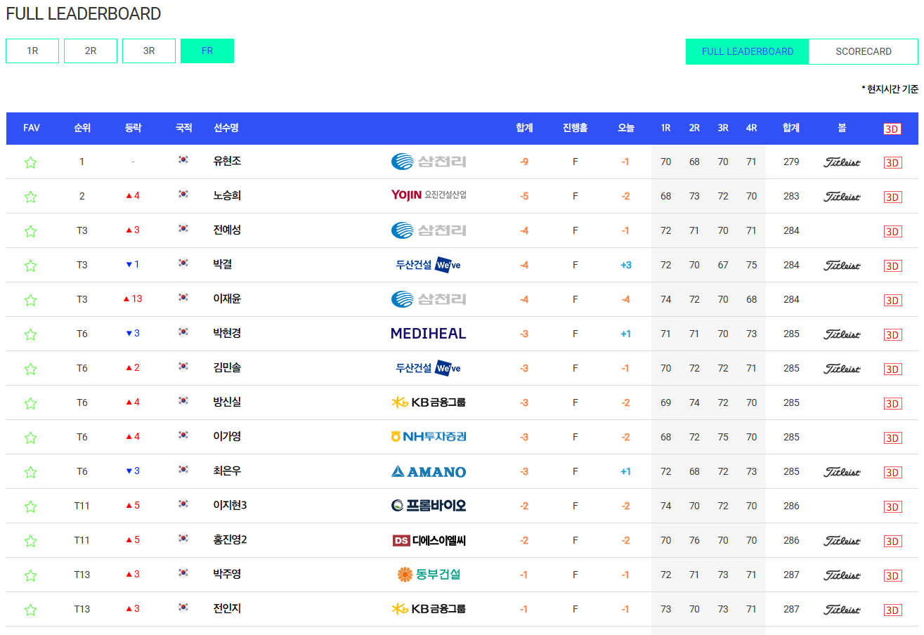 승부의 쐐기: 이 두 개의 연속 버디로 유현조 선수는 노승희 선수와의 격차를 다시 3타 차이로 벌리며 승기를 잡았습니다. 이후 흔들림 없이 파 세이브를 이어갔고, 마지막 18번 홀(파5)에서 우승을 자축하는 버디를 추가하며 완벽한 마무리를 보여주었습니다.