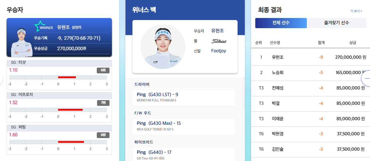 대상 포인트 1위 등극: 우승 상금 2억 7천만 원과 함께 대상 포인트 100점을 추가한 유현조 선수는 총 482포인트로 홍정민 선수(400포인트)를 제치고 당당히 1위로 올라섰습니다.
