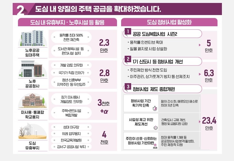 국공유지 및 유휴 부지 활용: 오래된 공공청사나 학교 용지 등 사용되지 않는 국공유지를 적극적으로 복합 개발하여 2.8만 호의 주택을 공급합니다. 서울 위례 강서 지역의 미사용 부지 4천 호를 즉각적으로 개발하는 등 구체적인 계획도 포함되었습니다.