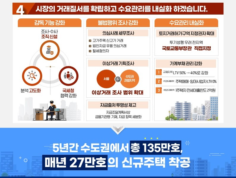부동산 감독기구 신설: 투기 근절을 위해 새로운 부동산 감독기구를 신설합니다. 이 기구는 감독, 조사, 수사 기능을 모두 갖추어 시장 교란 행위를 체계적으로 막아낼 예정입니다.